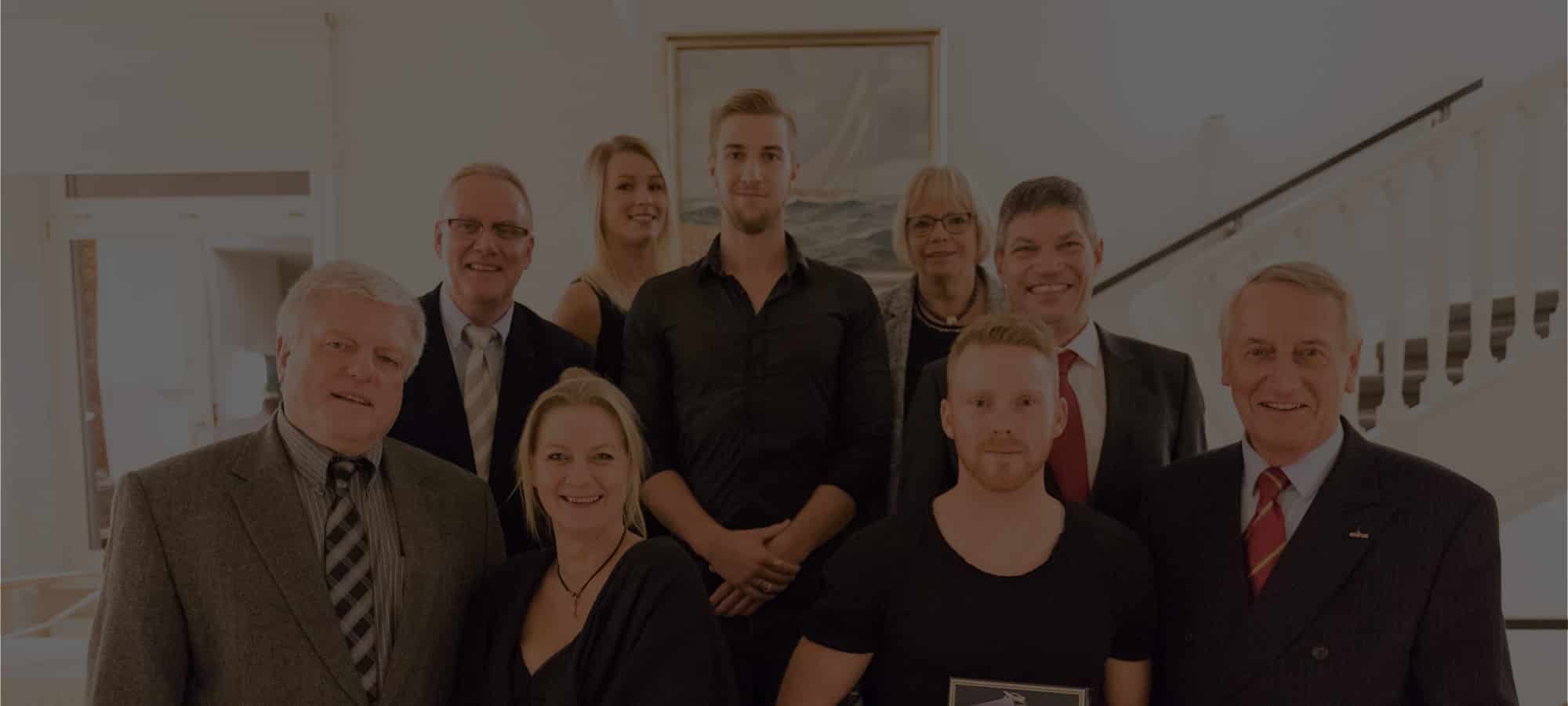 Das Foto zeigt ihn (2.v.r.), umringt von stolzen Funktionsinhabern und Freunden, zusammen mit dem FAI-Präsidenten, Frits Brink, (1.v.r.) unmittelbar nach der Ehrung in Kiel.